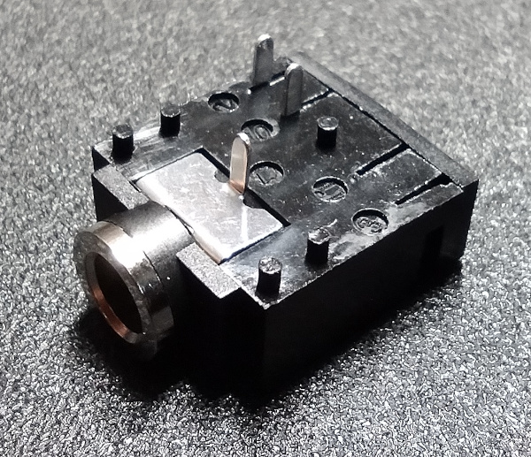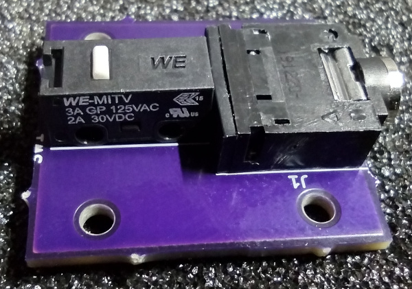 Notice that the barrel connector opening on the audio connector hangs over the edge of the board. The audio connector has pegs on the bottom that should fit closely into the non-plated through holes on the PCB. The audio connector should not fit correctly in any other orientation than that shown in the picture. The collar on the barrel of the connector should just slip past the edge of the PCB so that the connector's bottom is flush with the surface of the board. However, there is a minor design flaw with the current PCB that may cause the barrel of the audio connector to interfere with the edge of the board. This prevents the body of the audio connector from laying flush. If the audio connector looks like the following image, then the connector is interfering with the edge of the PCB.